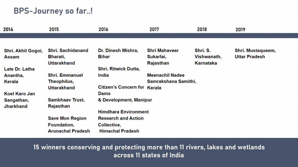 The BPS award, started in 2014 “To recognize the unsung heroes for their outstanding and sustained efforts towards protection and conservation of rivers”, includes cash prize of Rs 60 000/-, citation and award. So far till 2019 has been awarded to individuals/ organisations. The AMM instituted in 2017 “To celebrate journalists and media professionals who have established an exceptional body of credible work on various aspects of rivers leading to changes in behaviour, public discourse, law and policy” includes a medal and certificate. It has been so far given to two persons.