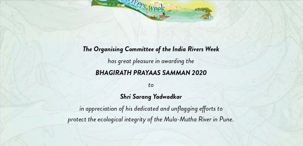 The BPS Award citation for Sarang Yadwadkar said: “Sarang Yadwadkar has devoted himself to protecting the Mula-Mutha riverbed and floodplain from encroachment… Sarang Yarwadkar’s sustained work has attracted the attention and support of fellow-citizens. His continuing crusade has educated the public about the need to respect the integrity of rivers. He has shaped our collective imagination about how to protect and cherish the natural heritage of our cities. It is our honour to recognise and celebrate Shri Sarang Yadwadkar’s unsung yet inspiring efforts to protect the Mula-Mutha River in Pune.”