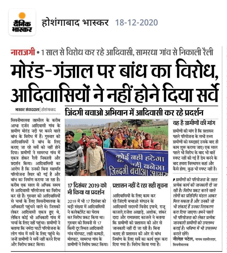 Tribals of large number of villages from Seoni Malwa Tehsil of Hoshangabad district in Madhya Pradesh have been strongly opposing the Morand Ganjal dam for several years now, as they again came out in large numbers this week on Dec 17, 2020, also remembering their rally exactly a year ago on Dec 17, 2019. They has simple demand: plz first provide all the information about the project in Narmada Valley and get approval of all the involved villages as required under the law. But the arrogant administration has not even responded to basic demand of all the relevant information.