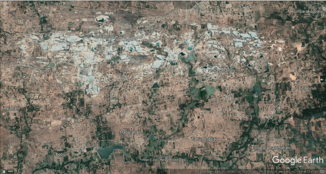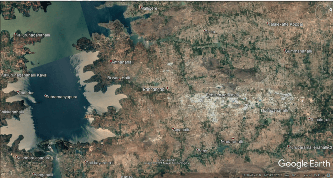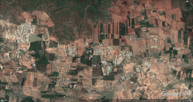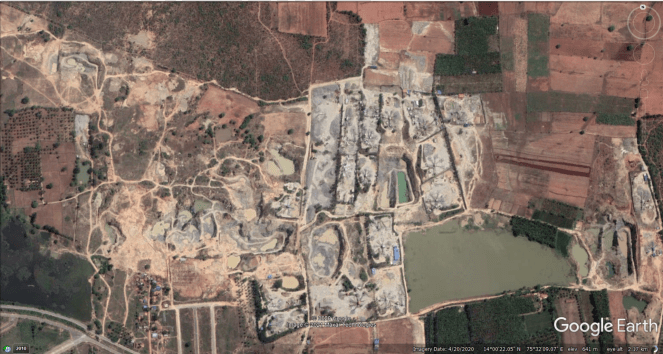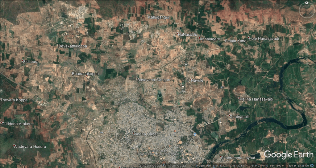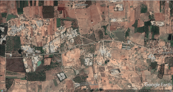 The Google Earth images show there are several stone quarries in areas in close human habitation. The sites are in Tunga river basin which flows about 7 km away in south of Shivamogga town.