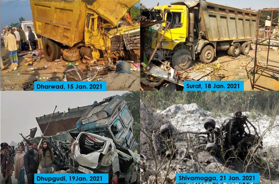 | 4 | 15.01.21 ~07:30 am | Itigatti cross, NH 48, Dharwad | Sand tipper | Negligence driving | 11/6 (9 women 2 men died) | All women including a professor were college friends. |