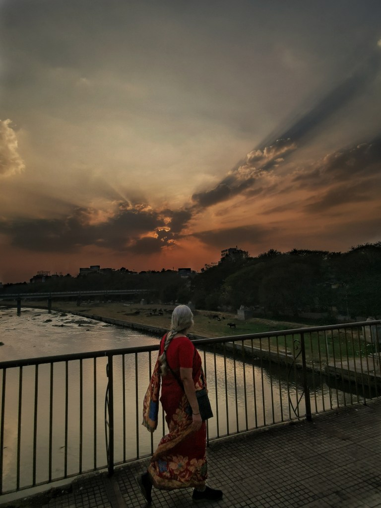 As a photographer, the river interests me, but more so, the people. Especially people walking on the bridges. Not all of them stop to watch the river, but many do. School-children, college friends, families, men with friends, men alone. Women, on the other hand, seldom stand against the bridge-railing and peer down. On the streets and bridges of a city, women are always in a hurry.
