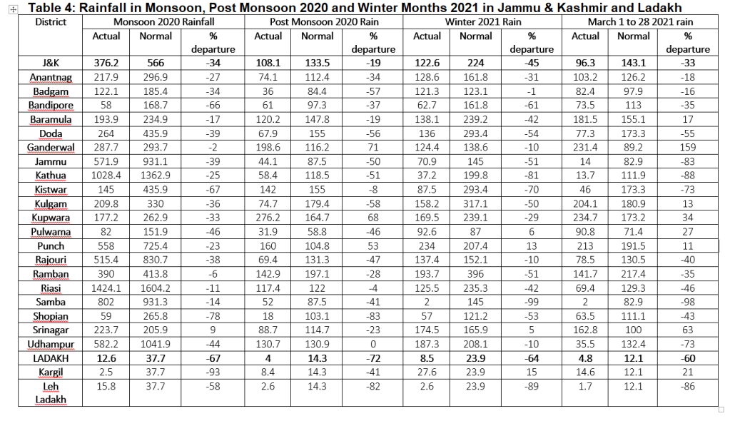 The rainfall was deficient by 67% in Ladakh during monsoon (June-Sept) and 72% in post monsoon months of Oct-Dec 2020 and 64% in winter months of Jan-Feb 2021. Similarly the J&K got -34%; -19% and -45% rainfall than normal in these periods. In Himachal rainfall has been deficit by 26%, 15% and 70% while the Uttarakhand witnessed 20%, 71% and 56% less rainfall than normal in monsoon, post monsoon 2020 and winter months of 2021.