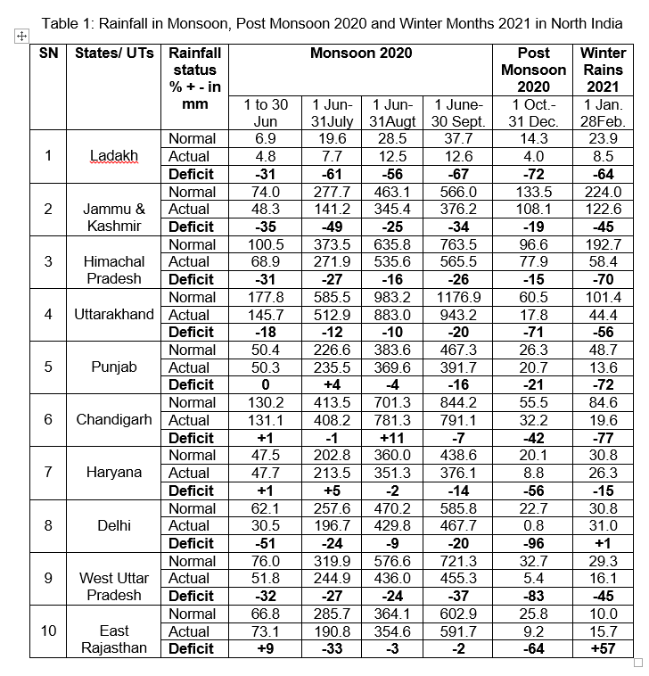 The 4 Union Territories (UTs) and 6 states in North India have received significant deficit in rainfall during June to September monsoon months, October to December post monsoon months in 2020 and January-February 2021 months.