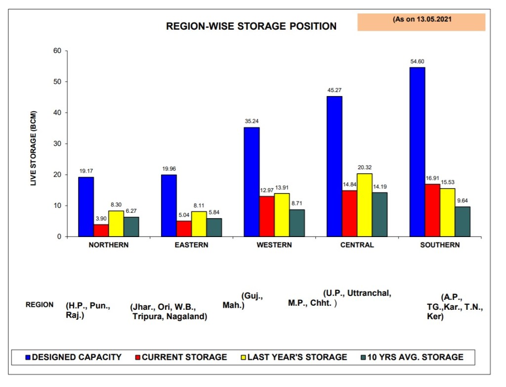 b) EASTERN REGION- As per Reservoir Storage Bulletin dated 13.05.2021, the total live storage available in these reservoirs is 5.04 BCM which is 25% of total live storage capacity of these reservoirs. The storage during corresponding period of last year was 41% and average storage of last ten years during corresponding period was 29% of live storage capacity of these reservoirs.
