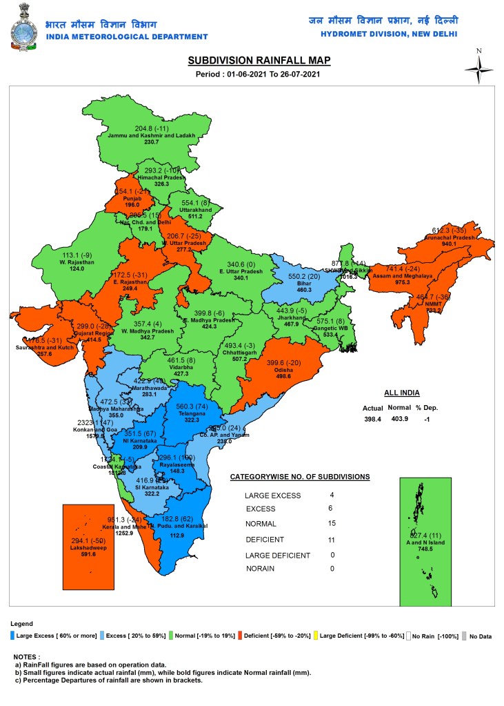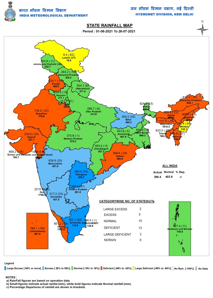 Mahabaleshwar in western Maharashtra reported over 60cm of rainfall in the last 24 hours (Thursday morning to Friday morning July 22-23) which “exceeded its all-time record” according to the IMD. From Friday morning to 5.30 p.m., it recorded 18 cm. According to the IMD’s district rainfall data for Maharashtra, except for five districts, all the other 31 got “large excess rains”. https://www.thehindu.com/news/national/monsoon-revival-sees-rise-in-extreme-rainfall-events/article35497898.ece (23 July 2021)