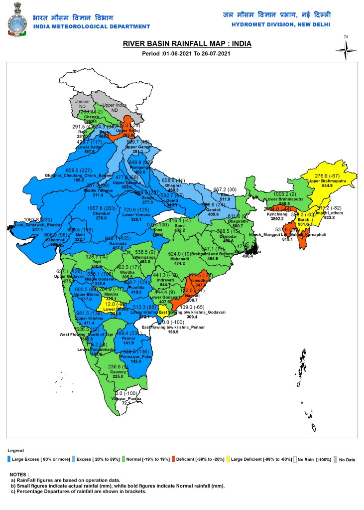 At present, Satara is among few districts in western Maharashtra with 81 per cent surplus rain. Since June 1, surplus rain has been recorded over Ratnagiri (66 per cent), Kolhapur (61 per cent), Raigad (49 per cent), Pune (38 per cent), Mumbai (28 per cent), Parbhani (107 per cent), and Jalna (77 per cent). Only Nandurbar (-52 per cent) and Dhule (-25 per cent) remain rain-deficient districts, but rainfall over these districts has been below normal since the beginning of this season. https://indianexpress.com/article/cities/pune/incessant-rain-pushes-up-reservoir-stock-in-bhima-krishna-river-basins-7422008/ (26 July 2021)