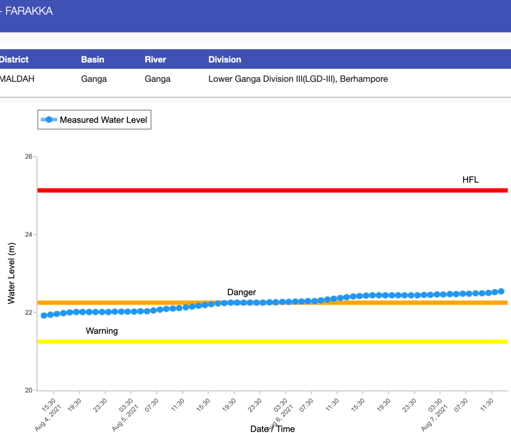 As can be seen from CWC’s flood hydrograph for Farakka above, the Ganga water level at Farakka went above the danger level of 22.25 m in evening hours of Aug 5, 2021 and has shown rising trend since then. This level is likely to remain above danger level till close to the end of the monsoon season, as is normally the case.