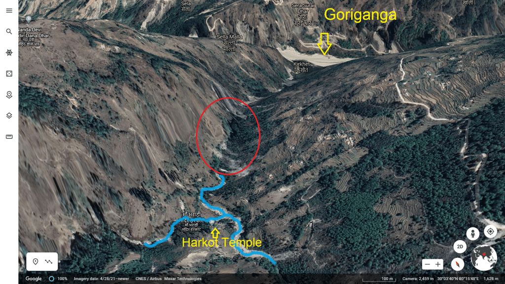 Local reports mention flash flood threats to low lying areas for about five villages namely Madkot, Bhadeli, Rumalkhet, Malupati, Gorichal. Google Earth 3D satellite image shows Charkham, Kirkhet two villages along Bharadi stream. The Madkot is local market town on left bank of Gauri Ganga and Malupati is located slightly uphill opposite Madkot on right bank of Goriganga. Both locations are approximately 6 km downstream the artificial lake.