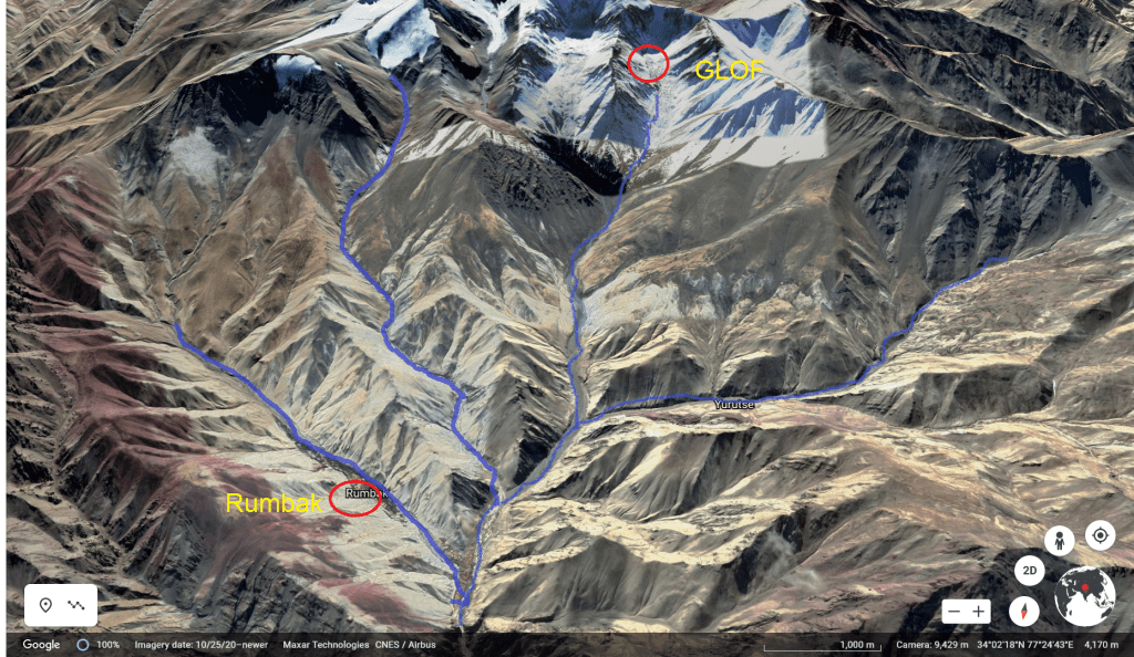 The GLOF uphill Rumbak caused formation of one more artificial lake downstream, showing that these are real emerging threats. The exact location of second artificial lake is still unknown. We are waiting for more clear satellite images by experts explaining both events with exact locations, impacts and would update the post accordingly.
