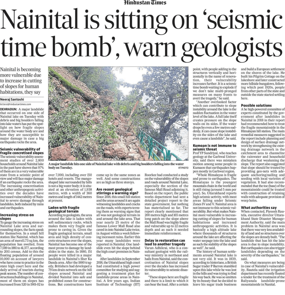 They divided the 223-km long stretch of the national highway into 21 zones for their field study. They found around 100 places right from Rishikesh to Kedarnath where rocks are weak and there are over 40 points out of them like Dharasu, Raithali, Vyasi, Utrasu, Kaliyasaun, Saknidhar, Baswa, Phata, Soneprayag and Rambada where chances of landslide are “high” owing to weakened rocks strength and shear strength of debris. https://timesofindia.indiatimes.com/city/dehradun/rishikesh-kedarnath-highway-has-40-spots-with-high-landslide-vulnerability-finds-study/articleshow/85572089.cms (24 Aug. 2021)