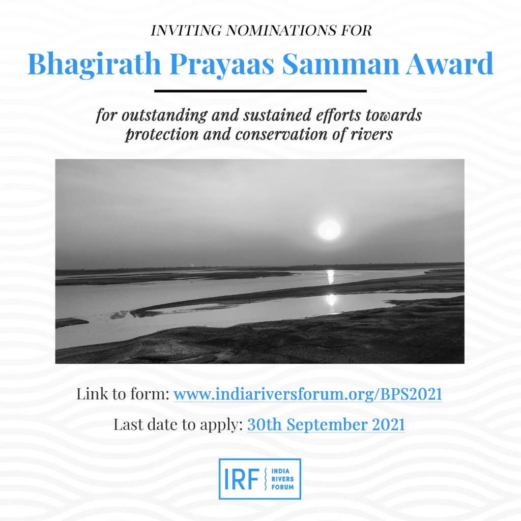 India Rivers Forum Inviting nominations for Bhagirath Prayaas Samman (BPS) award, to recognize the unsung heroes for their outstanding & sustained efforts towards protection & conservation of rivers. Please share this and nominate folks. See the link for form: http://indiariversforum.org/BPS2021