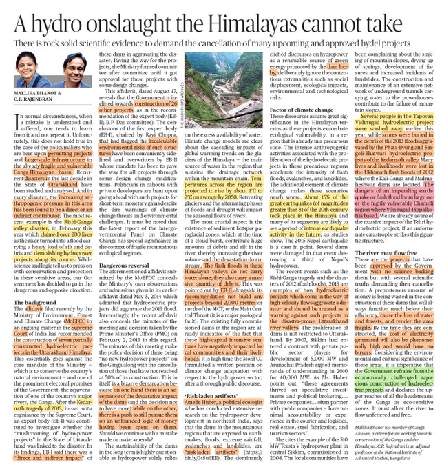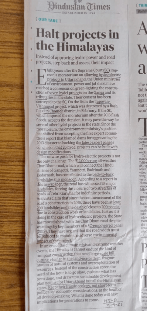 Editorial in the Hindustan Times clearly asking to stop destructive Hydropower and Char Dham Highway projects in Uttarakhand. https://www.pressreader.com/india/hindustan-times-ranchi/20210904/281685437952363 (04 Sept. 2021)