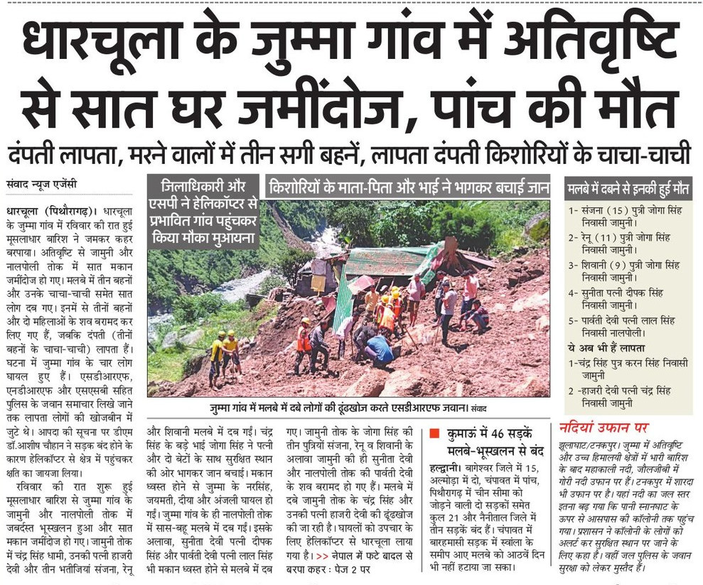 जगथाना गांव को धनाबगड़ तोक से जोड़ने वाला पैदल पुल भी क्षतिग्रस्त हो गया है। इससे तोक के छह परिवारों को आवाजाही में परेशानी हो रही है।चचई गांव में करीब 50 खेत मलबे से पट गए हैं। बागेश्वर में अनर्सा-झटक्वाली मोटर मार्ग के किनारे खड़ी पिकअप सड़क के धंसने से खेत में पलट गई। हरसीला-पुड़कूनी सड़क पर आए मलबे में एक वाहन फंस गया। रेवती नदी के कटाव से सड़क ध्वस्त होने के कारण हरसिंग्याबगड़, बड़ेत, नौकोड़ी सहित आधा दर्जन से अधिक गांवों का संपर्क कपकोट तहसील मुख्यालय से कट गया है। https://www.amarujala.com/dehradun/uttarakhand-weather-today-latest-news-disaster-in-pithoragarh-after-extreme-rainfall?pageId=2 (30 Aug. 2021)