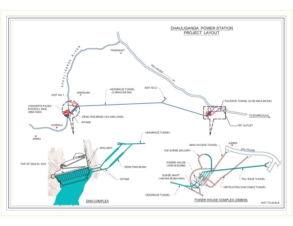 Dhauliganga as right bank tributary joins Kali river at Tawaghat about 5km downstream of the Chirkila dam site. The power station of the project is located on right bank of Kali river near Jumma village about 5 km downstream Tawaghat.