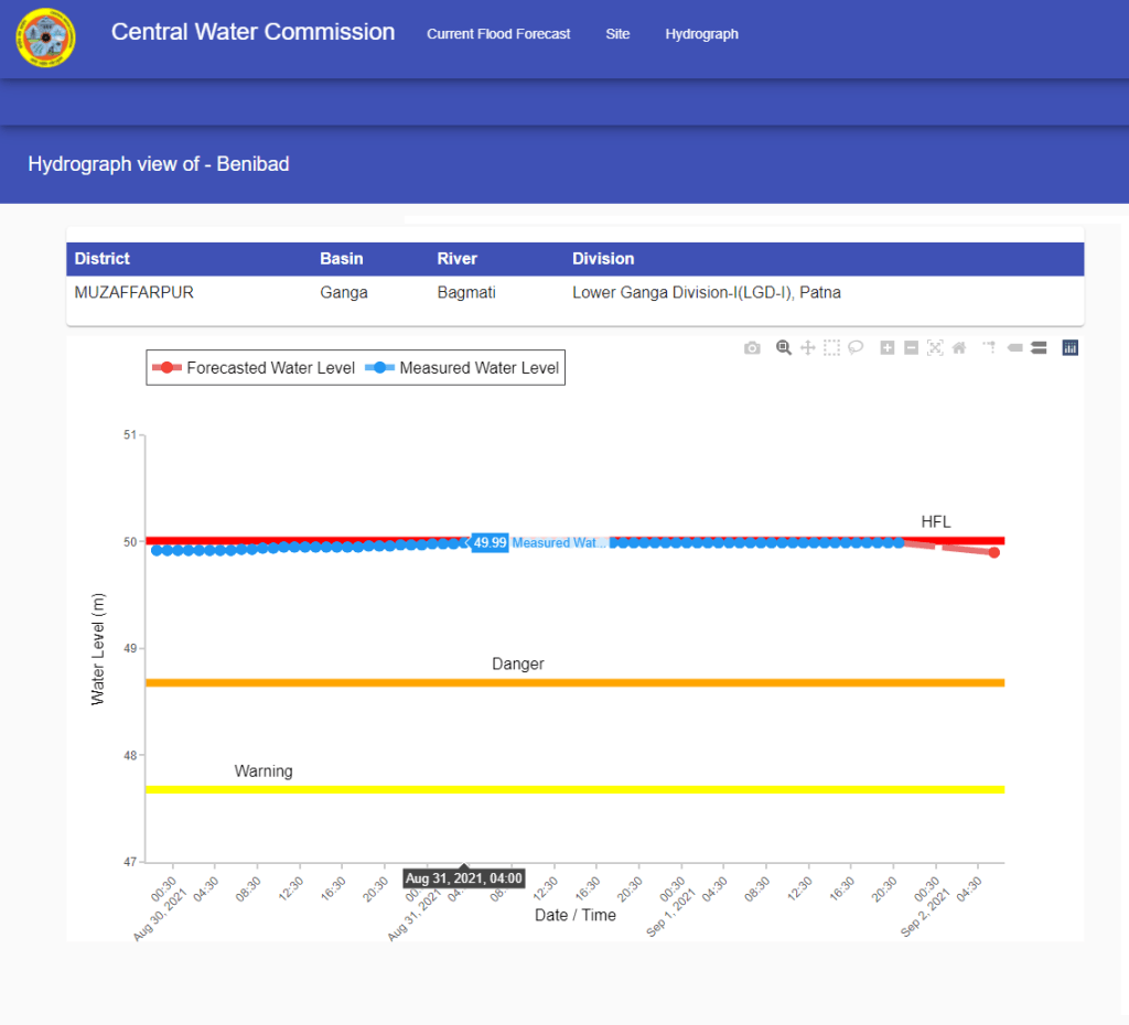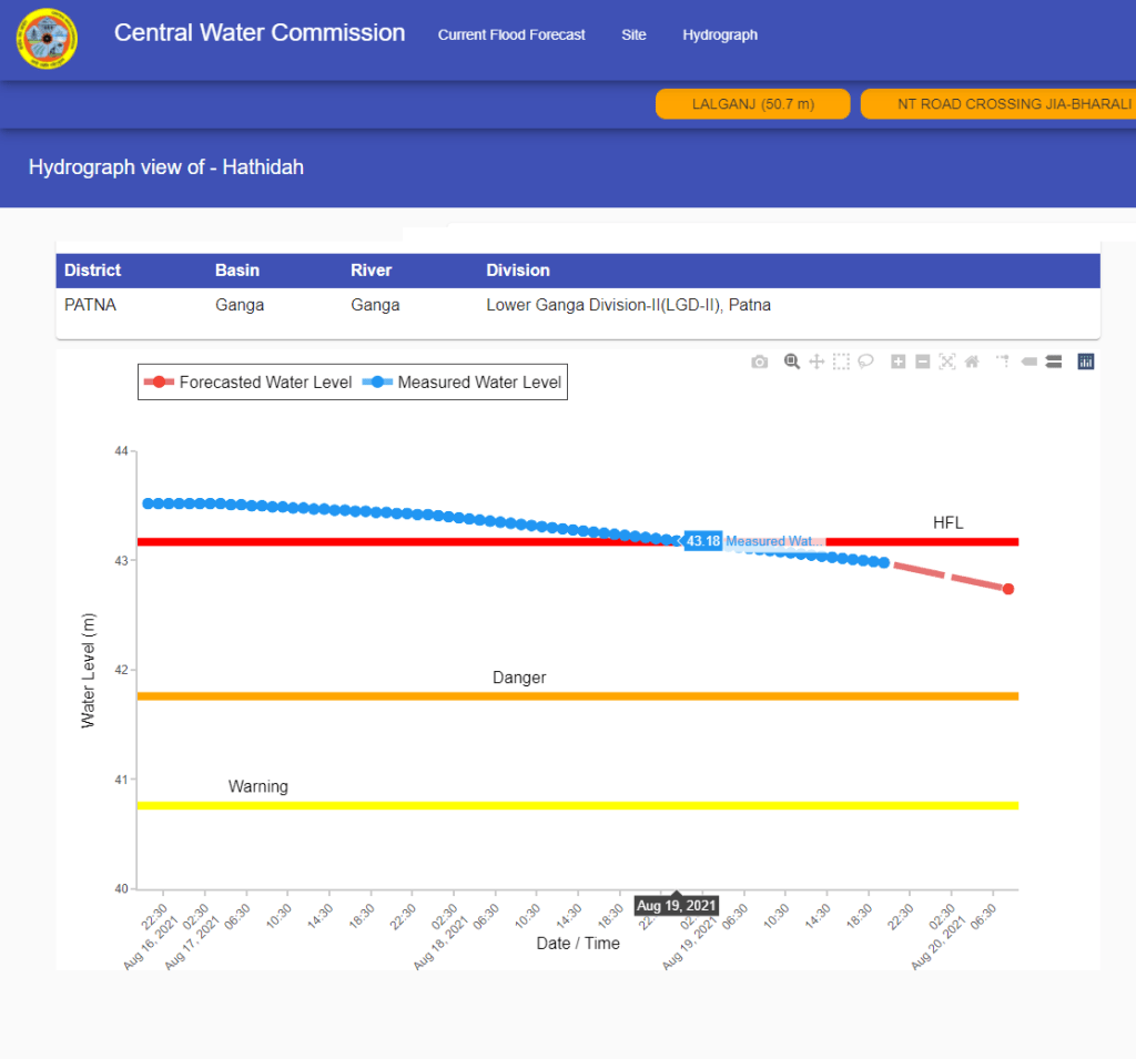 | 11 | Flood water remained above old HFL for 142 hrs at Hathidah level forecast site on Ganga river from 03:00 hrs on August 13 to 01:00 August 19, 2021. HFL is breached after 5 years. |