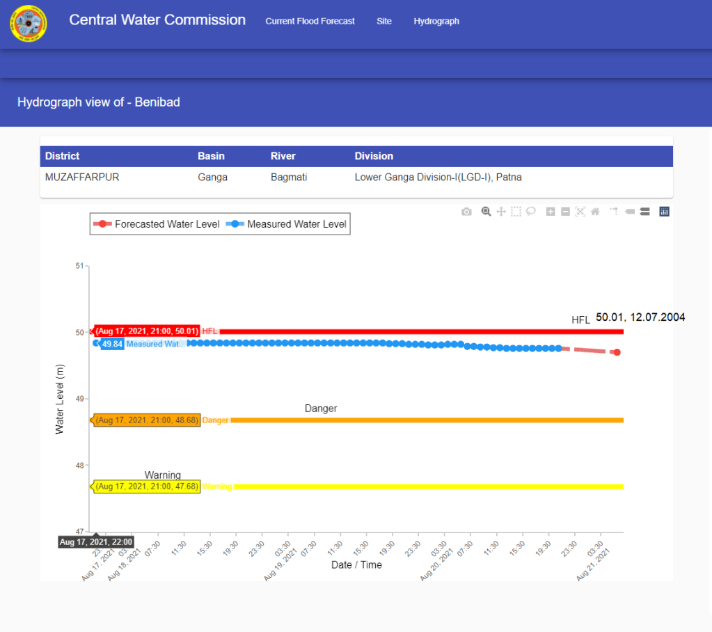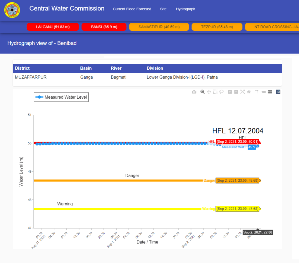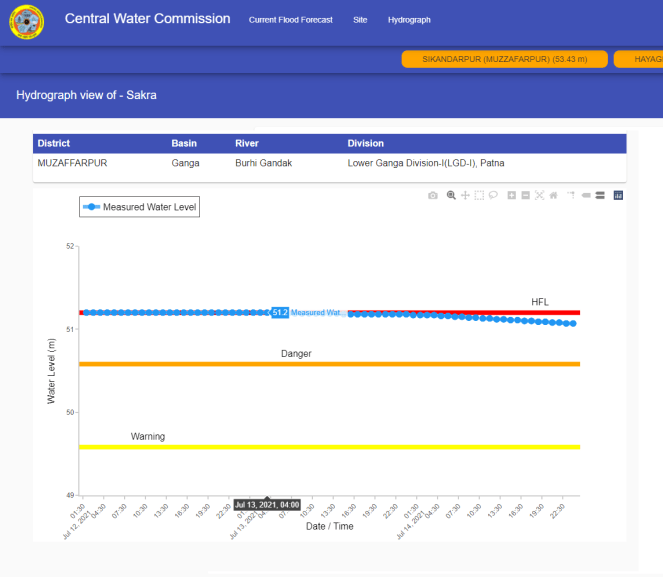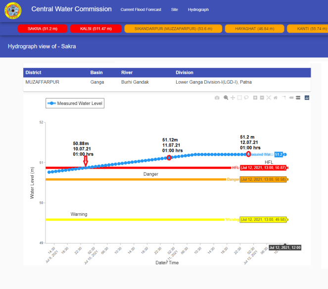 | 9 | In 2020, Sakra level forecast site on Burhi Gandak was upgraded into level forecasting site from level monitoring. The Old HFL was breached at 01:00 hrs on July 10, 2021. The flood level remained over old HFL probably till July 14, 2021. The HFL is breached after 4 years. Despite flowing in extreme flood situation, CWC did not mention it in its Daily Flood Summary reports of July 12 and 13. HFL was breached at this site on 28 July 2020 also then attaining new HFL of 51.40 however the CWC has not updated the HFL attained even last year. |