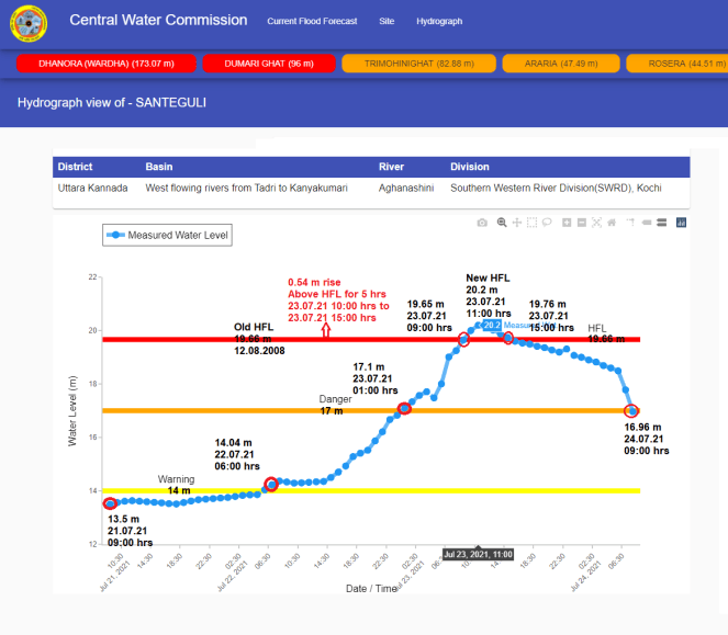 The Aghanashini river breached old HFL at Santeguli level forecast site at 10:00 hrs on July 23 and remained above old HFL for 05 hrs till 15:00 hrs. HFL is breached after 13 years. CWC has upgraded new HFL.