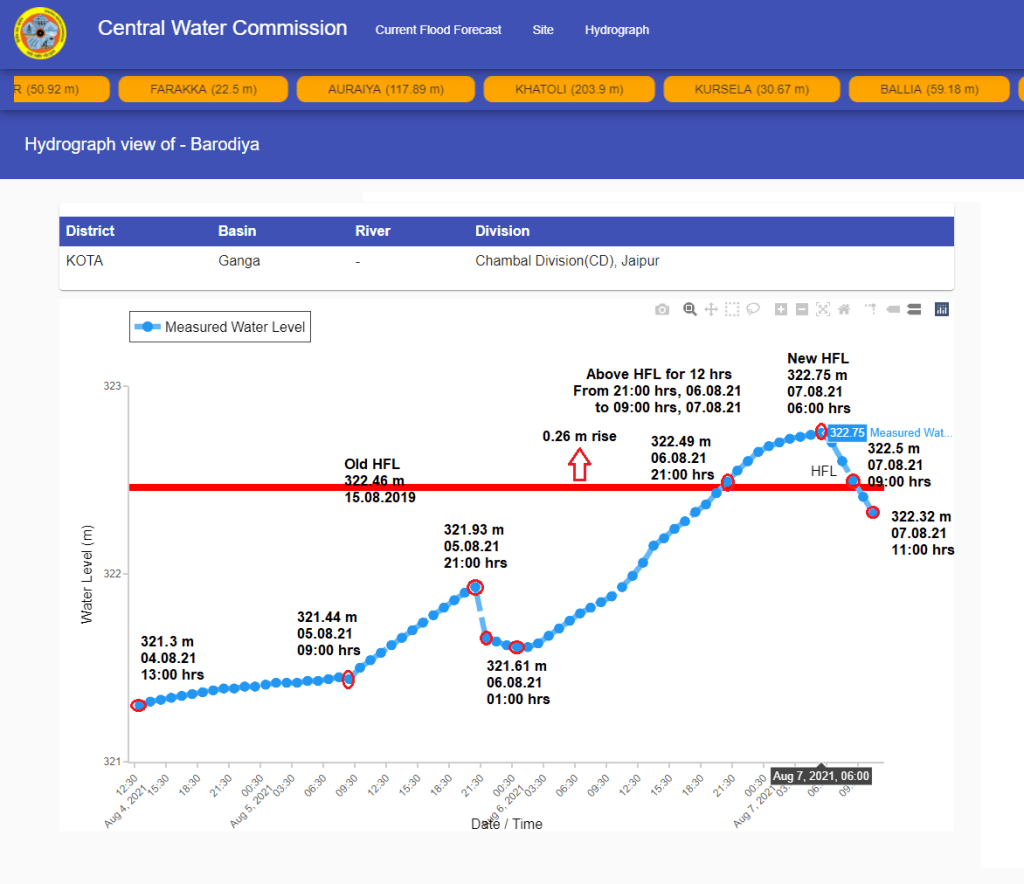 | 5 | River name is not mentioned for Barodiya level forecast site which is part of Chambal sub-basin. Flood level remained above old HFL for 12 hrs from 21:00 hrs on August 6 to 09:00 hrs on August 07. The HFL is breached after 2 years. |