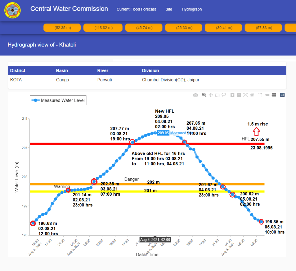 | 6 | The flood level remained above old HFL for 17 hrs from 19:00 hrs on August 3 to 12:00 hrs on August 04, 2021. HFL is breached after 25 years. |