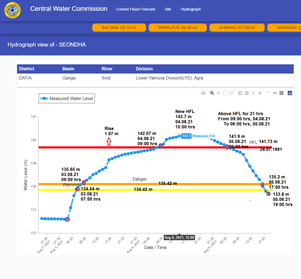 | 7 | The flood level remained above old HFL for 26 hrs at Seondha level forecast site on Sind river from 08:00 hrs on August 4 to 7:00 hrs on August 05, 2021. HFL is breached after 30 years. |