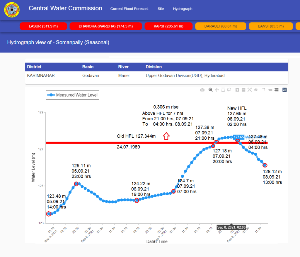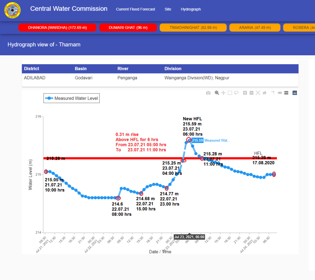 | 4 | Old HFL is breached at 05:00 hrs on July 23 at Tharnam level monitoring site on Penganga river and flood level remained above old HFL for 6 hrs till 11:00 hrs on July 23. HFL is breached after 1 year. CWC has not upgraded new HFL as on Oct. 2, 2021. Strangely, CWC hydrograph now shows HFL to be 223.6 m attained on 12.09.1998. |