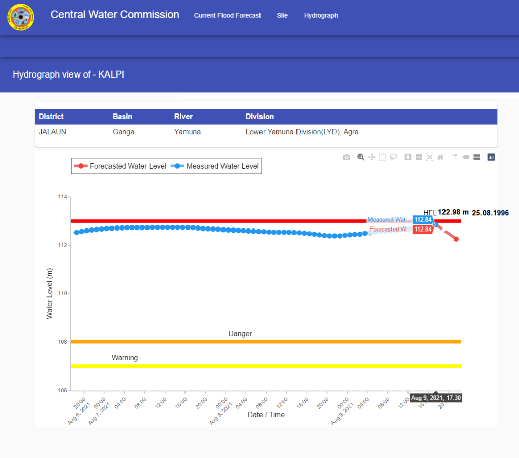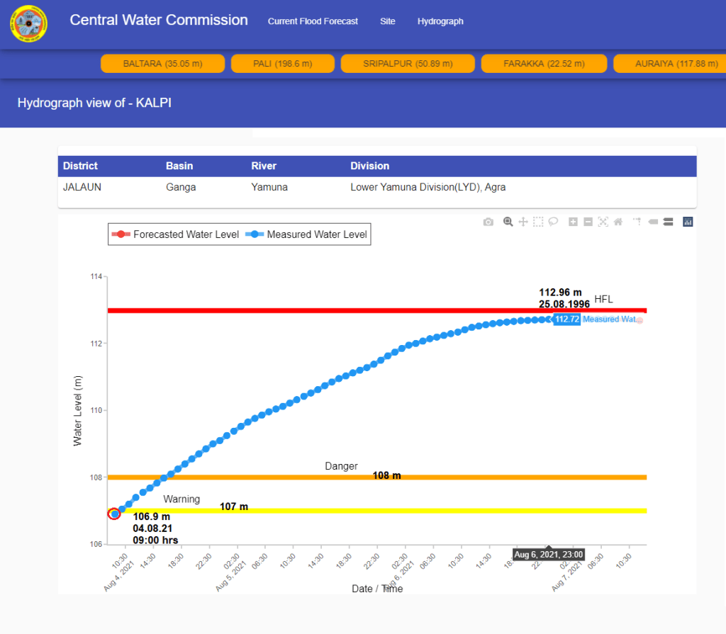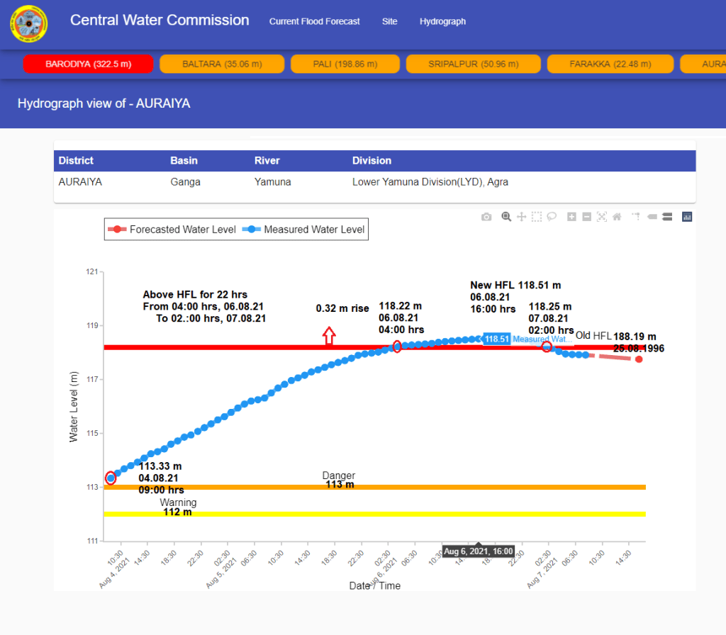 | 4 | Flood level flew over old HFL for 22 hrs at Auraiya level forecast site on Yamuna from 04:00 hrs on August 06 to 02:00 hrs on August 07, 2021. HFL is breached after 25 years. CWC has upgraded the new HFL. |