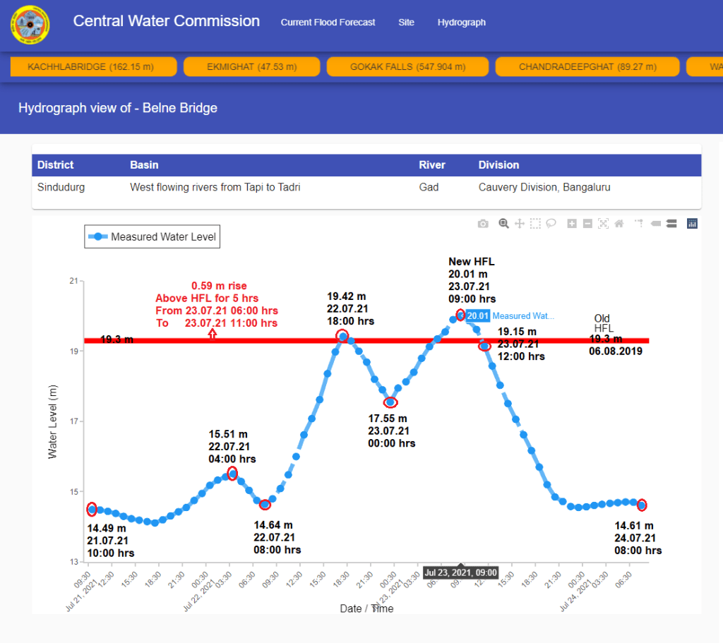 | 1 | At Belne bridge level monitoring site on Gad river, the old HFL is breached twice first on July 22 then on July 23 at 06:00 hrs. Level remained above old HFL for about 5 hrs till 11:00 hrs on July 23. HFL is breached after 2 years. |
