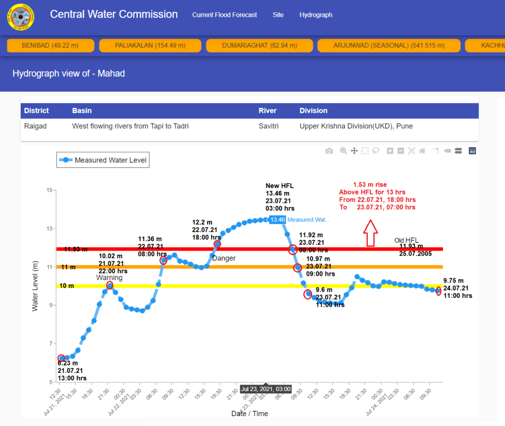 | 3 | At Mahad level forecast site on Savitri river the old HFL is breached at 18:00 hrs on July 22. Level remained above old HFL for about 14 hrs till 08:00 on July 23. HFL is breached after 16 years. |