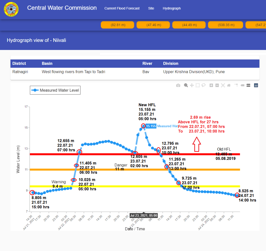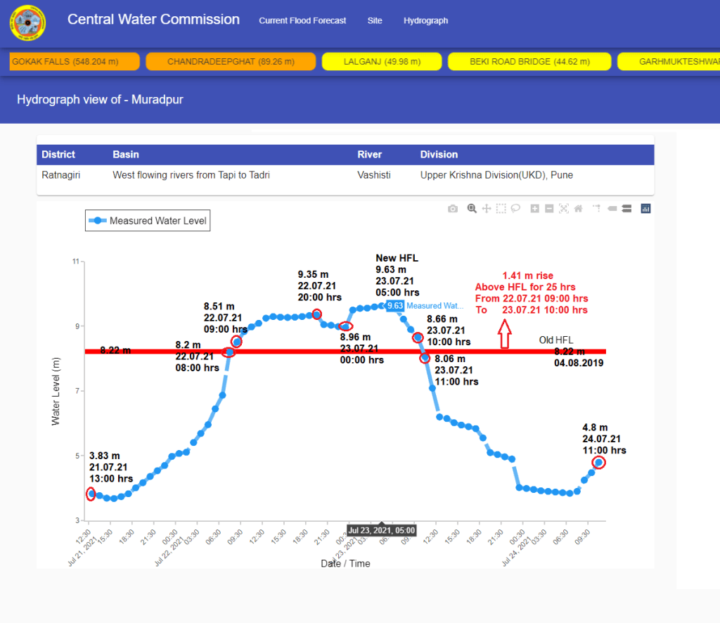 | 4 | Old HFL is breached at 09:00 hrs on July 22 at Muradpur level monitoring site on Vashisti river. Level remained above old HFL for about 25 hrs till 10:00 hrs on July 23. HFL is breached after 2 years. CWC has not upgraded new HFL as on Oct. 3, 2021. |