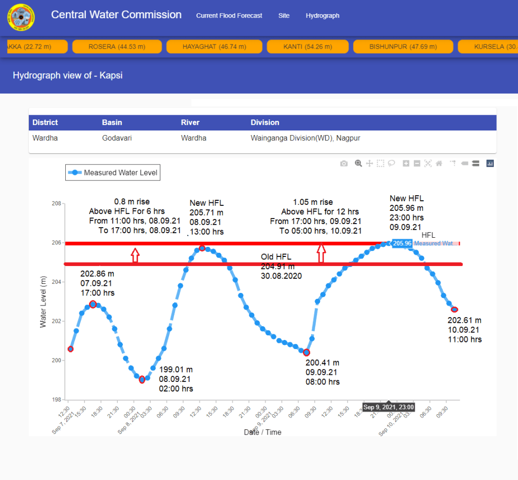 | 2 | The old HFL has been breached twice at Kapsi slevel monitoring site on Wardha river. First on Sept. 8 flood level flew over old HFL for 6 hrs from 11:00 hrs to 17:00 hrs. Then on Sept. 9, the flood level stayed over old HFL for 12 hrs from 17:00 hrs Sept. 9 to 05:00 hrs on Sept. 10, 2021. HFL is breached after one year. Strangely, CWC hydrograph now shows HFL to be 212.31 m attained on 12.07.1994 after the passage of HFL events. |