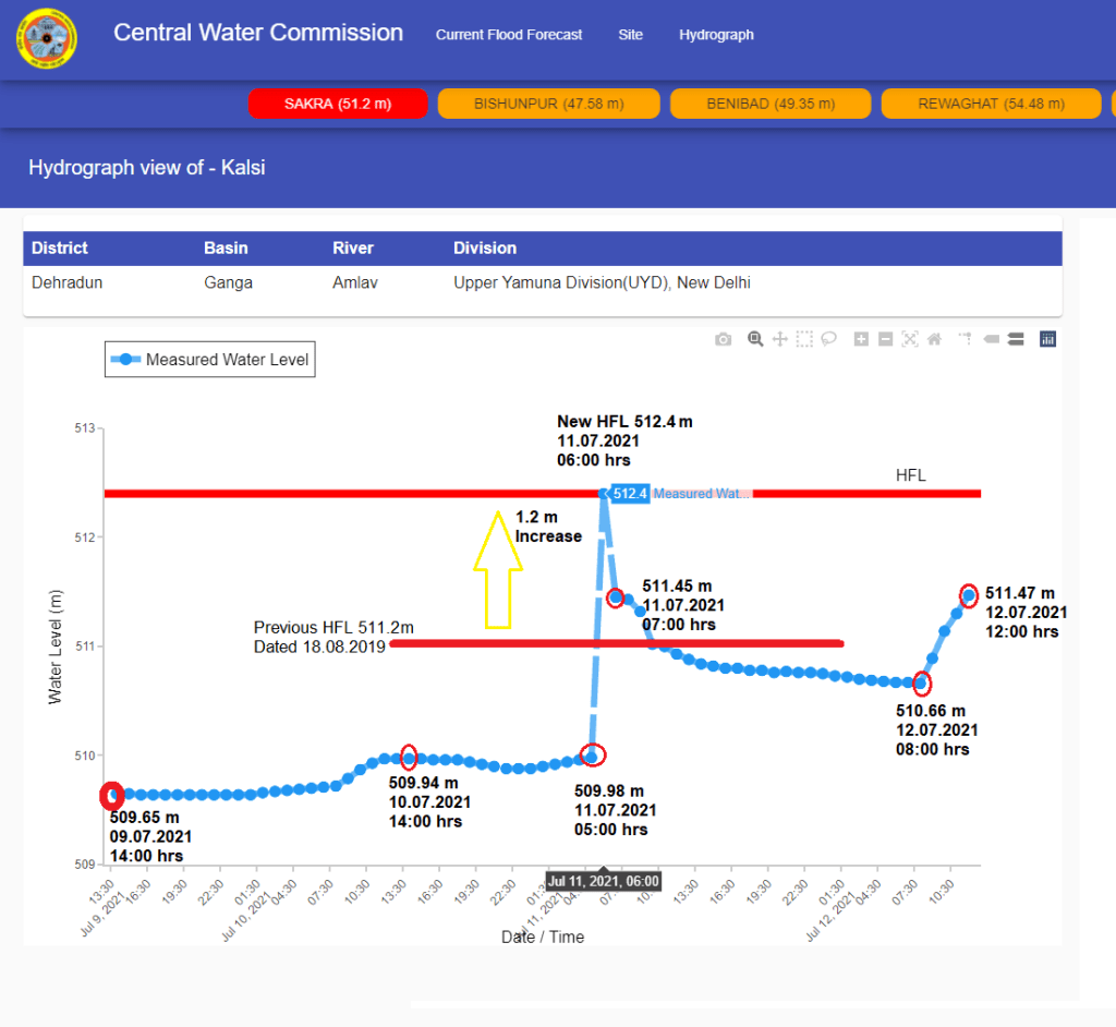 | 3 | Kalsi | Amlav Yamuna | Dehradun Uttarakhand | 511.2 m | 18.08.2019 | 512.4 m | 11.07.2021 06:00 hrs | 1.2 m | ||