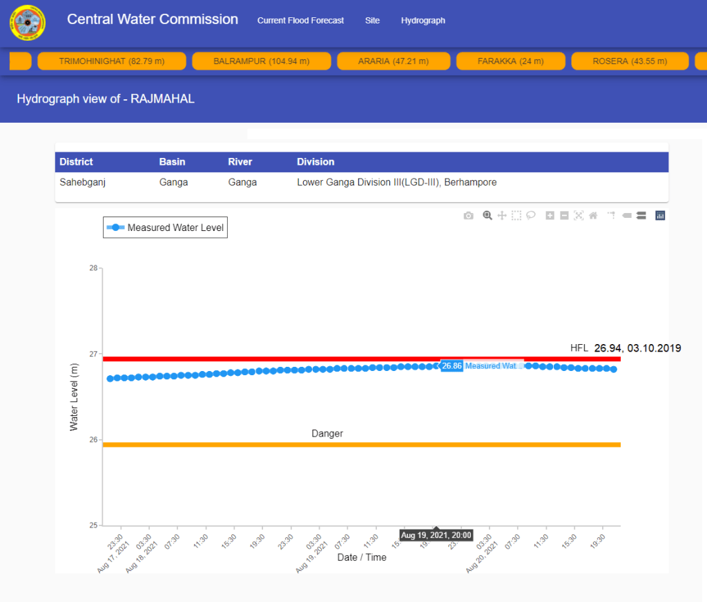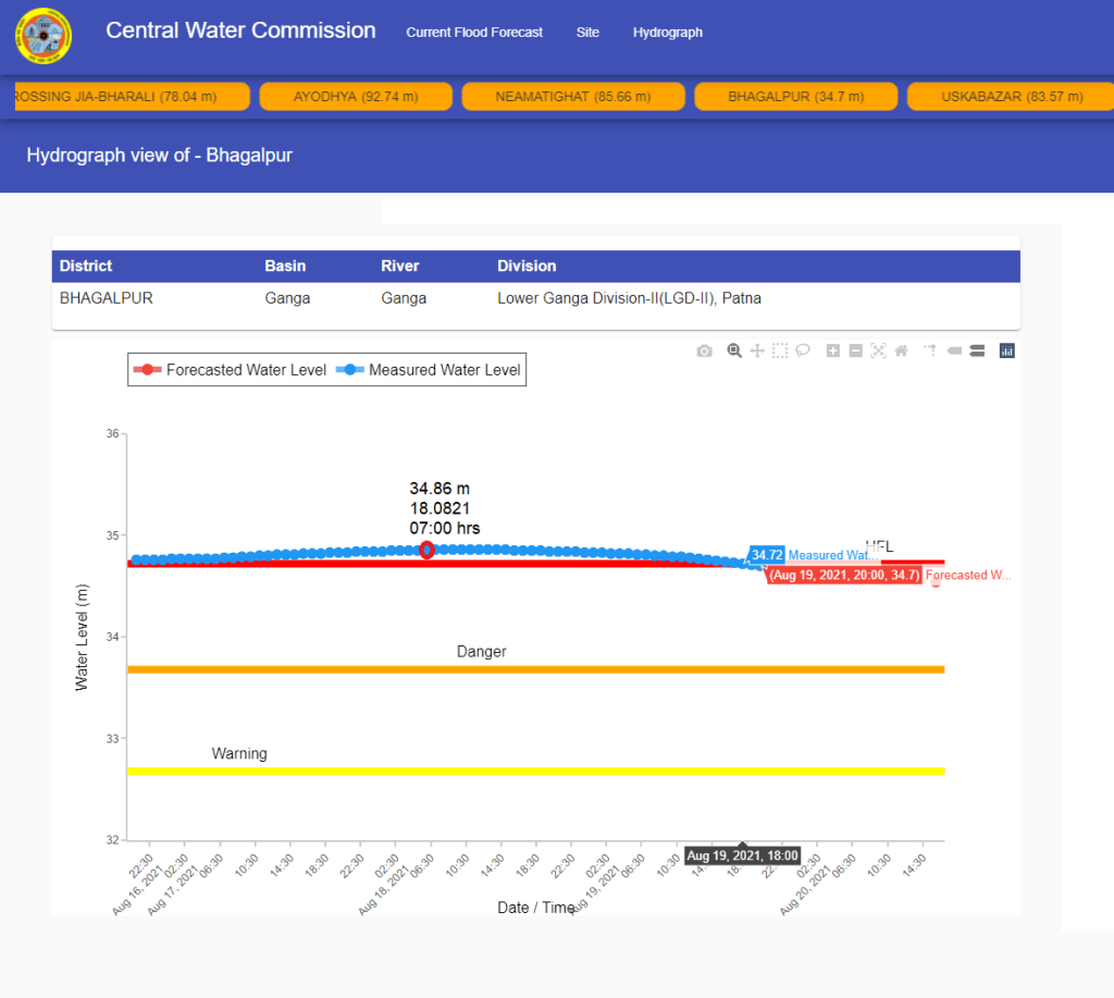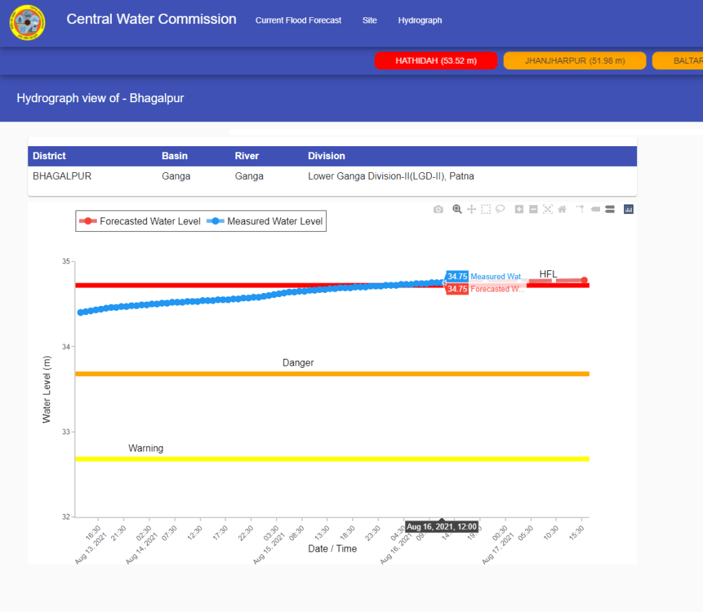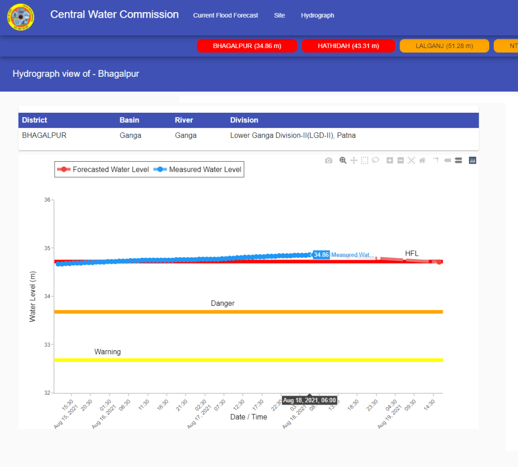 | 12 | Bhagalpur | Ganga | Bhagalpur Bihar | 32.68 m | 33.68 m | 34.72 m | 26.08.2016 | 34.86 m | 18.08.2021 07:00 hrs | 0.14 m |
