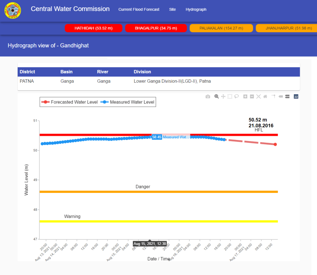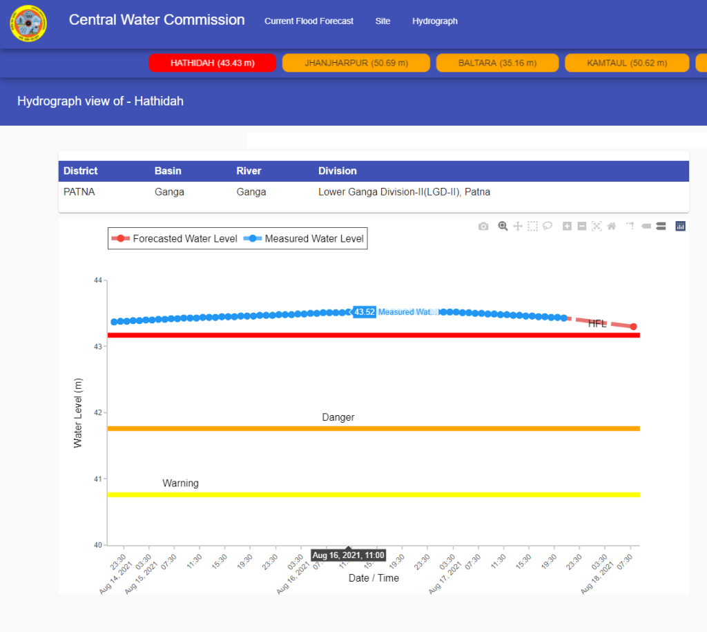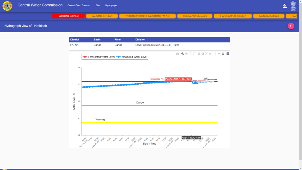 | 11 | Hathidah | Ganga | Patna Bihar | 40.76 m | 41.76 m | 43.17 m | 21.08.2016 | 43.52 m | 16.08.2021 11:00 hrs | 0.35 m |