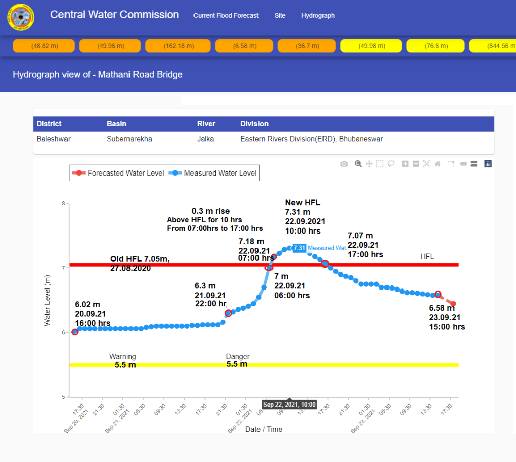 | 5 | At Somanpally level monitoring site on Maner river, the flood level remained over old HFL for 7 hrs from 21:00 hrs on Sept. 7 to 04:00 hrs on Sept. 8, 2021. HFL is breached after 32 years. CWC has upgraded new HFL. |