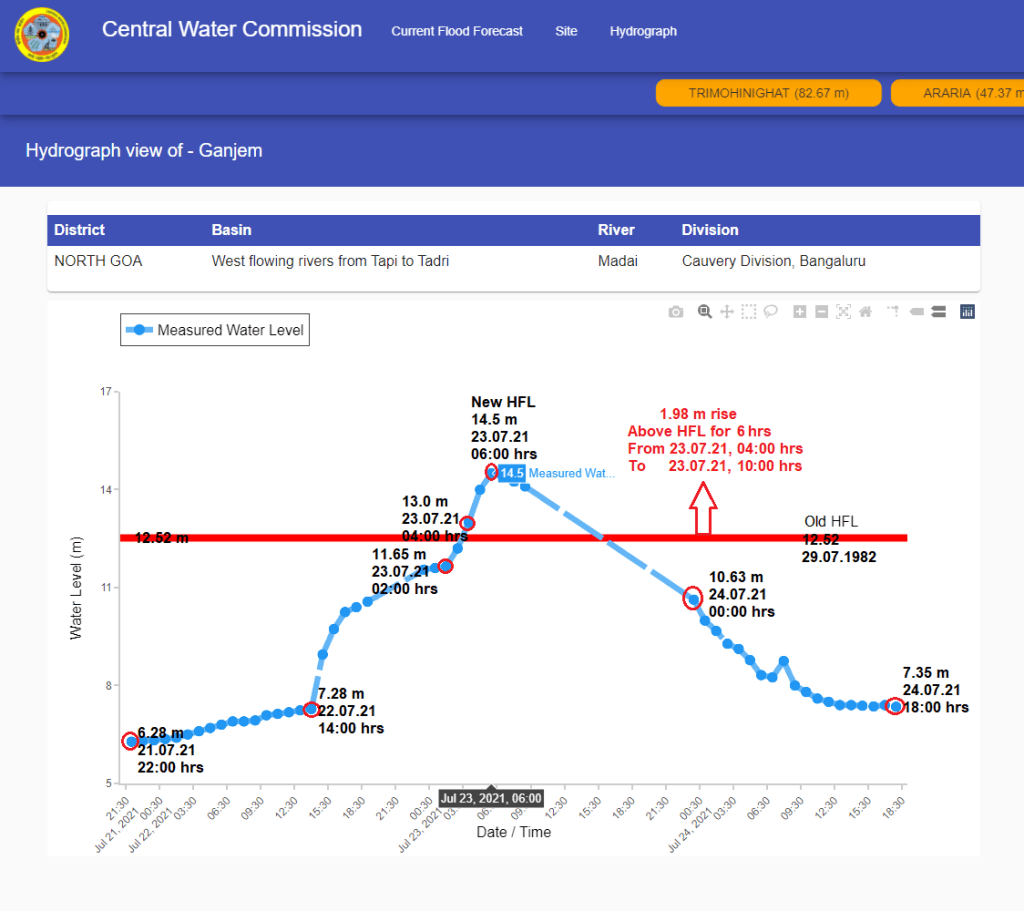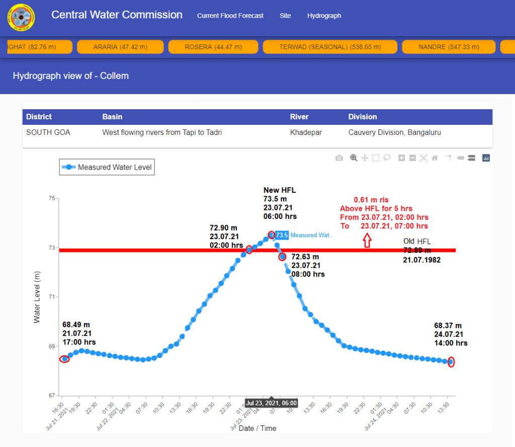 | 5 | At Collem level monitoring site Khadepar river breached old HFL at 02:00 hrs on July 23 and remained over old HFL for 5 hrs till 07:00 hrs on July 23. HFL is breached after 39 years. |