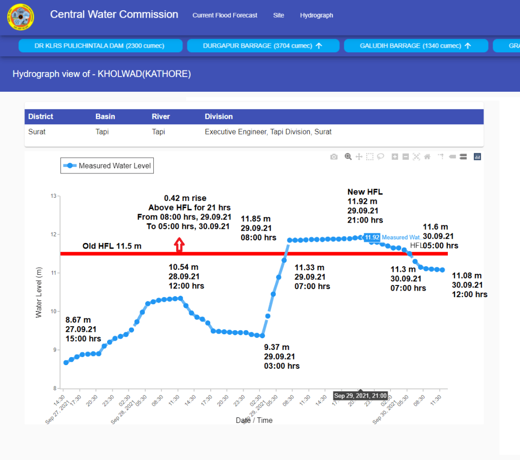 | 1 | Kholwad | Tapi | Surat Gujarat | 11.5 m | NA | 11.92 m | 29.09.2021 11:00 hrs | 0.42 m |
