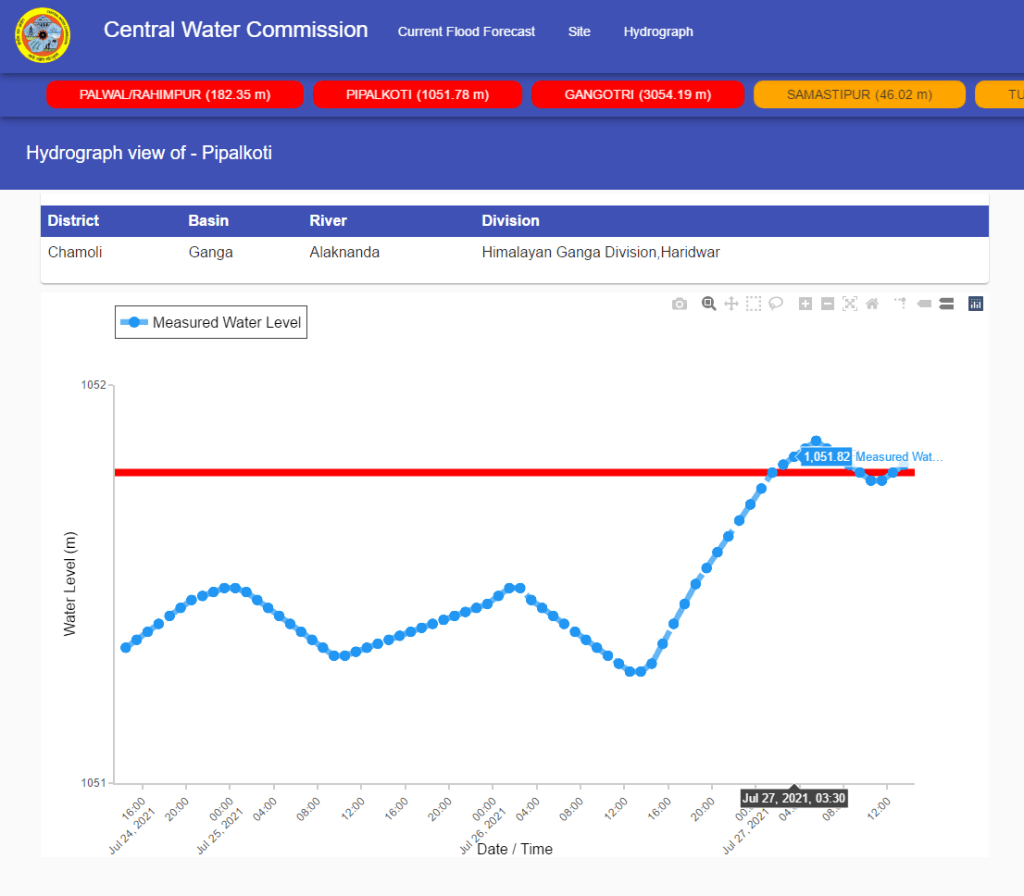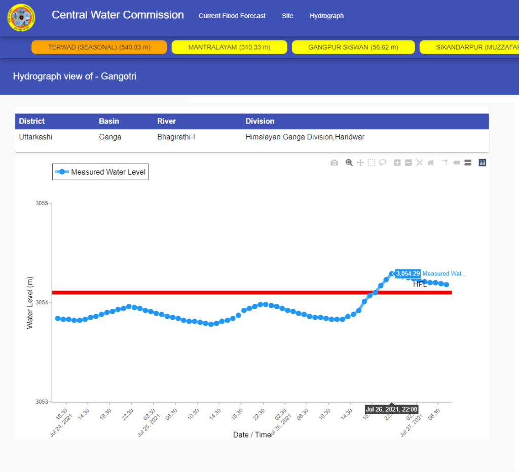 In Uttarakhand, the Bhagirathi-I at Gangotri in Uttarakashi district and Pipalkoti site on Alaknanda in Chamoli district has topped previous HFL. Next is Amlav river at Kalsi in Dehradun district. Amlav is tributary of Yamuna river. All 3 are level monitoring (LM) sites and had attained the earlier HFLs in 2019.