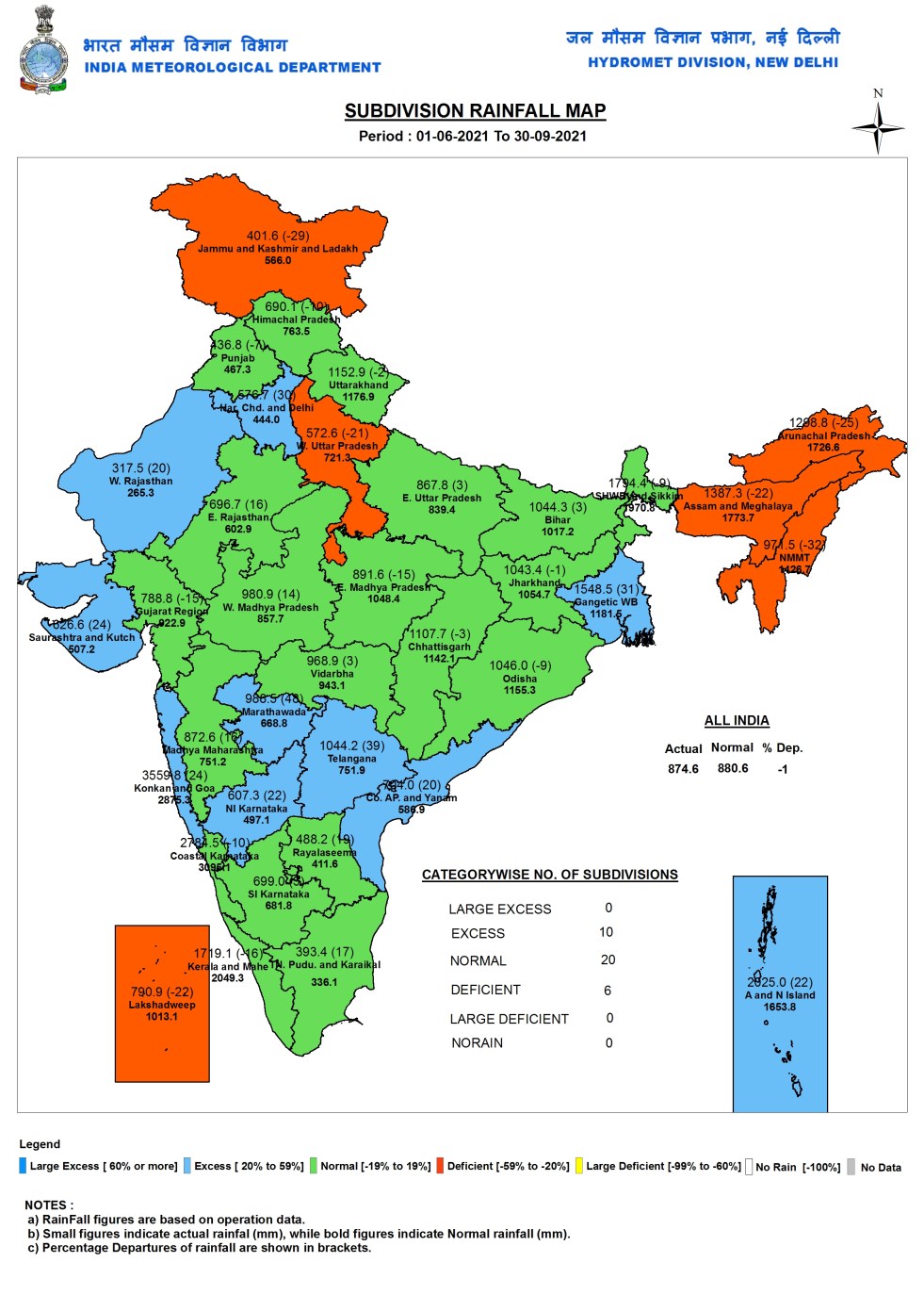 An analysis of the daily district wise rainfall data from India Meteorological Department (IMD) for the month of September 2021, the last month of India’s South West Monsoon 2021 shows that there were 489 instances when district rainfall of a day was above 50 mm. The normal monthly rainfall of India for Sept is 170.2 mm and actual rainfall was a huge 34.96% above normal at 229.7 mm[i], the actual average daily rainfall in this month was about 7.66 mm. Such high rainfall instances included 374 instances when rainfall was 50-100 mm, 84 instances when it was 100-150 mm, 20 times it was 150-200 mm and eleven times above 200 mm.