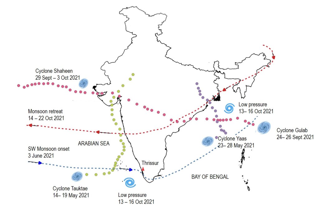 Figure 1. The disturbances in the Arabian sea and Bay of Bengal during this year’s (2021) cultivation season Source: Authors (Cyclone tracks taken from WikiProject Tropical cyclones/Tracks)