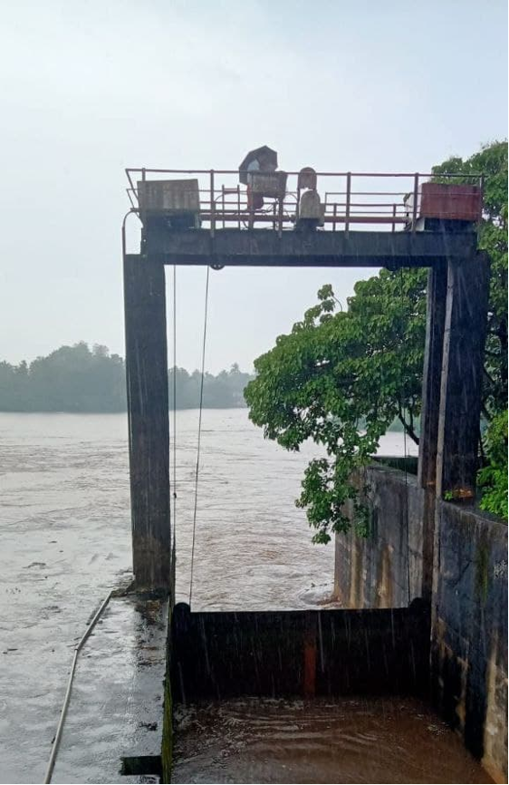 The shutters of Kanakkankadav on a bankful Chalakudy river being lifted in the morning by a local fishworker. 12 October 2021. Photo courtesy: MP Shajan