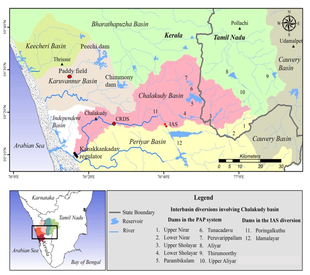 Figure 2: The Karuvannur river basin in which the paddy field is located and the neighbouring Chalakudy river basin, indicating the location of dams and regulators. PAP – Parambikulam Aliar Project; IAS – Idamalayar Augmentation Scheme; CRDS – Chalakudy River Diversion Scheme. Source: Authors