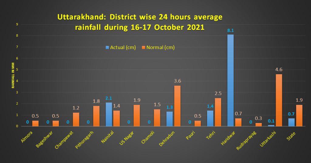 The rainfall intensity decreased in following 24 hours on October 19-20, 2021 (i.e. 24 hours ending at 0830 hours on Oct 20). As per MC, Dehradun daily rainfall report dated October 20 moderate rains were recorded at 10 stations whereas 8 stations registered heavy rains and 2 sites witnessed very heavy rains in 24 hours spread over 8 districts of state.