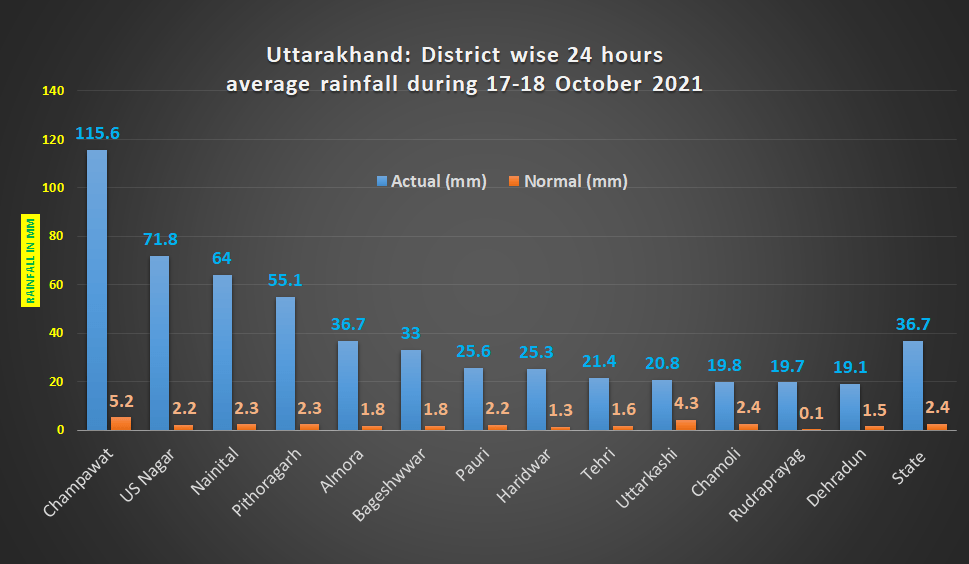 The heavy rainfall spell started in afternoon hours of October 17 and till 08:30 am of October 18, rainfall at 38 stations including AWS, Automated Rain Gauge (ARG) and Manual Observatory (MO) by State government and Indian Meteorological Department (IMD) in 7 districts recorded equal or more than 70 mm of rains according to the Daily Rainfall Report by MC, Dehradun and independent meteorologist, weather bloggers.