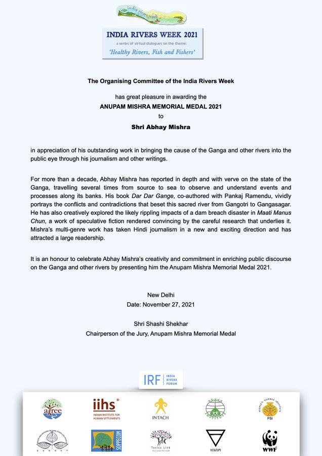 Winner of Anupam Mishra Memorial Medal, Abhay Mishra has reported in depth and with verve on the state of the river Ganga for more than a decade, travelling several times from source to sea to observe and understand events and processes along its banks. His book ‘Dar Dar Gange’, co-authored with Pankaj Ramendu, vividly portrays the conflicts and contradictions that beset this sacred river from Gangotri to Gangasagar. He has also creatively explored the likely rippling impacts of a dam breach disaster in ‘Maati Manus Chun’, a work of speculative fiction rendered convincingly by the careful research that underlies it.