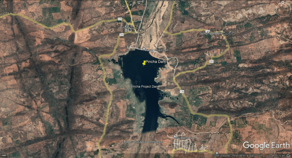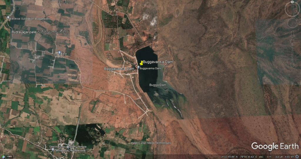 According to CWC’s National Register of Large Dams, Rayalacheruvu Dam (Project Identification Code: AP01LH0115) with longitude latitude 77° 15′ 00″ E; 15° 05′ 20″ N, Height 10 m, length 920 m has gross storage capacity of 2.39 MCM and Effective Storage Capacity of 1.84 MCM, Reservoir Area 232.3 Ha and spillway capacity of 21 cumecs.