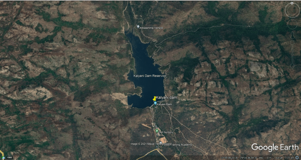The Kalyani[xiii] is a gravity dam constructed across Swarnamukhi river in Seshachalam hill ranges of Tirupati city in Chittoor. It was constructed in 1977 with 25 TMC storage capacity. According to CWC National Register of Large Dams, Kalyani Dam Gross storage capacity is 25.79 MCM (0.91 TMC) and Effective Storage Capacity is 24.83 MCM (0.88 TMC). Height of the dam from lowest foundation is 36 m, length is 500 m and Reservoir area is 2255 ha. Spillway Capacity is 1615 Cumecs.