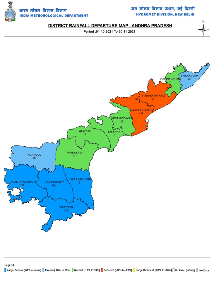 Andhra Pradesh The IMD’s rainfall map for Andhra Pradesh shows that like in case of Karnataka, the Deficit (two districts), Normal (5), Excess (2) rainfall districts are all in the North, while all the four Large Excess Rainfall districts (three of Rayalseema and Nellore) are in Southern part of the state.