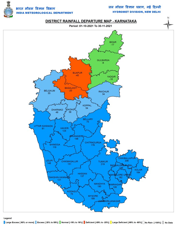 The Rainfall map of Karnataka districts for Oct-Nov 2021 rainfall given below from IMD provide district wise rainfall departures for Oct-Nov 2021. As we can see, all the Deficit (two districts), Normal (3), Excess (5) rainfall districts are in North and all the Large Excess Rainfall districts (20) are in the south, with Tumkur having the highest departure at 219% excess rainfall.