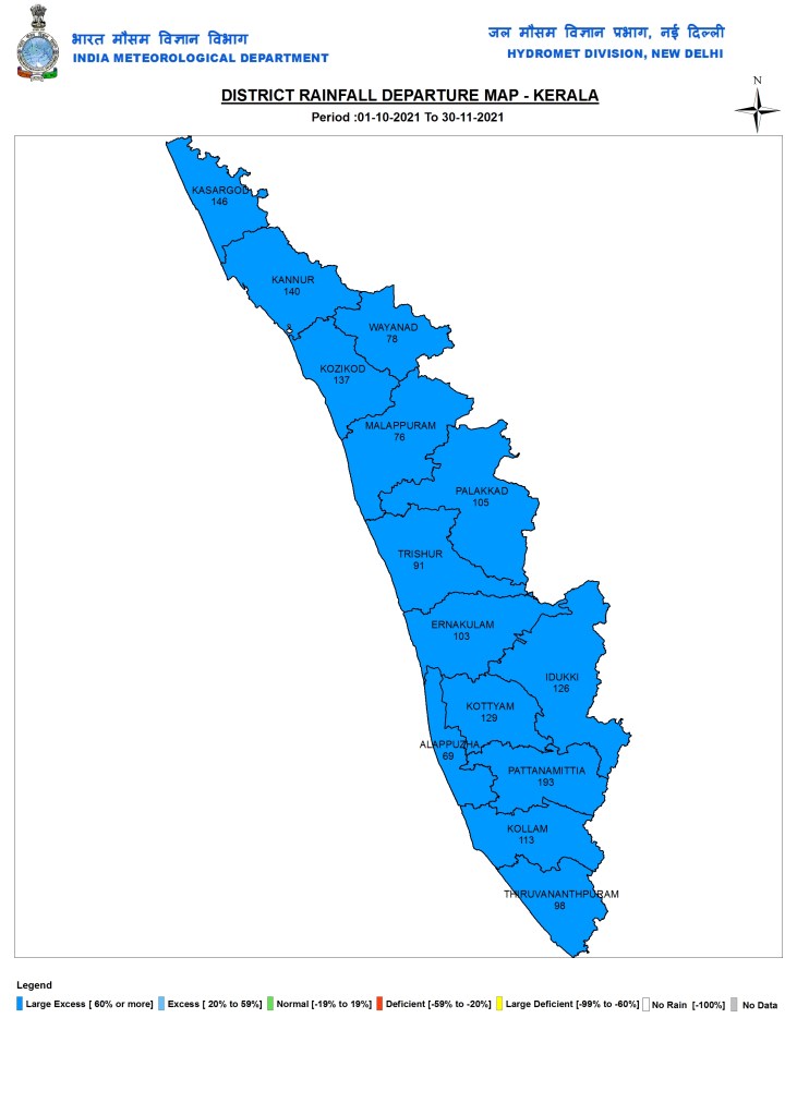 Kerala All the 14 districts of Kerala had Large Excess Rainfall in Oct Nov 2021 as we can see from IMD map. Nine of them had excess above 100% and four had rainfall above 1000 mm, with Patanamitta having the highest rainfall (1619.4 mm) and highest departure from Normal (193%).